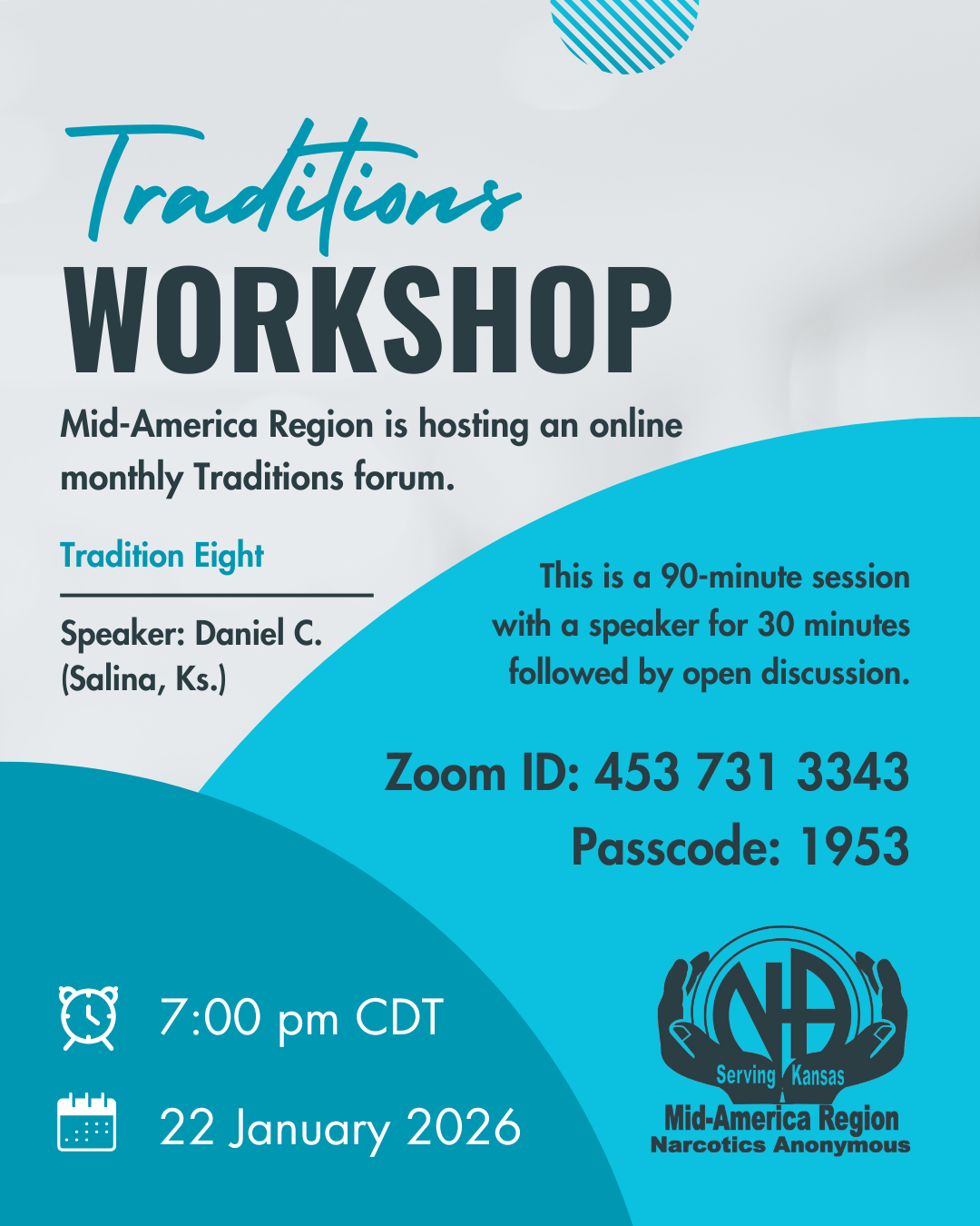 The Regional Service Committee (RSC) meets the third Saturday and Sunday in February, May, August, and November.  The RSC meetings are at 310 Swedonia St, Marquette, KS 67464.  Sub-committee meetings are held on Saturday, and the full RSC meets Sunday morning.