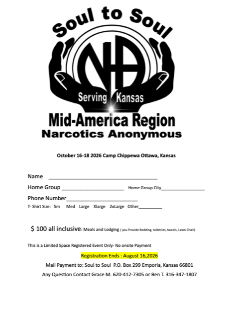 Soul to Soul 2026 Soul to Soul October 16-18, 2026 right click image to download or print © 2023 2025 Copyright. Mid-America Region of Narcotics Anonymous. All Rights Reserved.